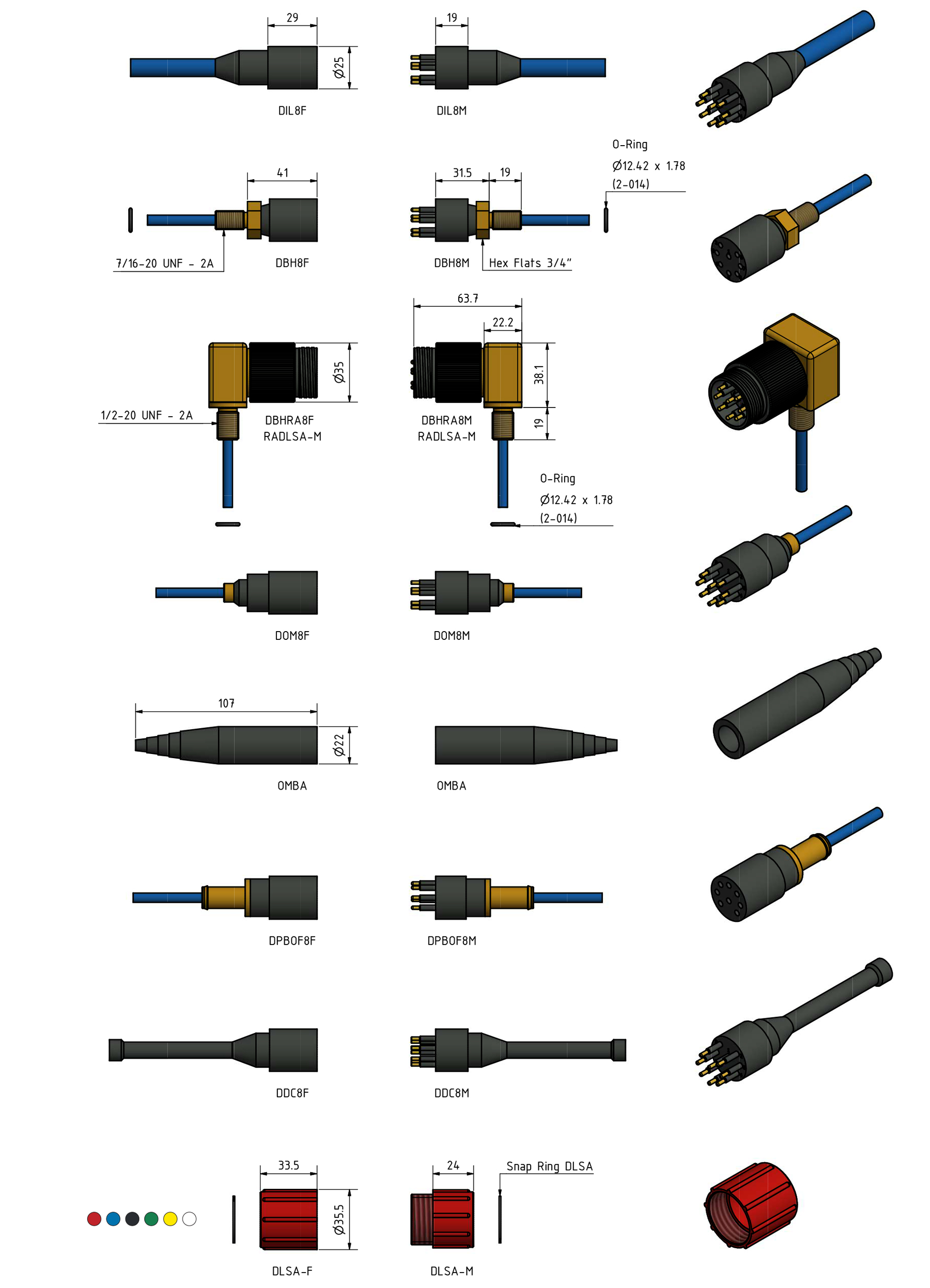 - Contacts: Female sockets in gold plated brass UNS - C36000, Male contacts in gold plated beryllium copper